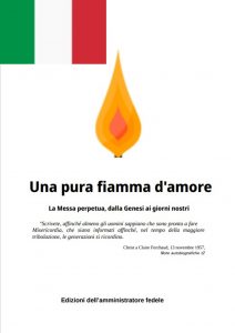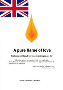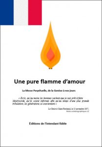 Une pure flamme d’amour est une étude publiée par les Editions de l’Intendant fidèle. Elle montre comment la demande de Messe Perpétuelle s’inscrit dans la continuité de l’Ancien Testament, de l’Evangile et de l’Histoire de la dévotion aux Coeurs de Jésus et de Marie, ainsi que dans la continuité de l’enseignement des papes. Ce livre est disponible à la Maison du Sacré-Coeur à Loublande. Le fichier vous est proposé ici gratuitement, avec l’aimable autorisation de l’auteur et de l’éditeur (cliquer sur l’icone de votre choix).